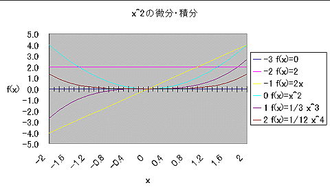 まずは、イメージを考えるためにグラフを作成してみる。x^2の関数、および、それを微分・積分した関数である。微分は3階まで、積分は2階まで行っている。