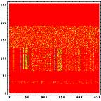横方向の1ライン分を一区画と考える。ハードディスクならセクタといったところか。その区画内でのヒストグラムを計算すると以下のようになる。この図では横方向が0から255までの存在量を示し、縦方向は区画を示している。