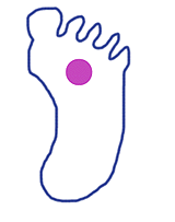 まずは、足を回転させてみると、その回転軸は下の図で紫の円で示したような場所に位置することがわかる。土踏まずと中指の根元の中央辺りである。