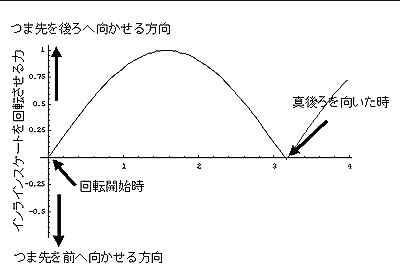 このグラフは縦軸が任意単位の「インラインスケートを回転させる力」を示しており、横軸がインラインスケートの回転軸に対する角度である。ちょっとでも、インラインスケートが回転軸に対して傾くと(θ(シータは文字化けしそう...)=0でなくなると)つま先を後ろへ向かせる方向へ力が働き急激に回転する。そして、つま先が真後ろを向き始めるとその力は弱くなる。つま先が真後ろを向いたところで、その力は0になり、もし回転しすぎると、また、真後ろへ戻す力が働く。そなわち、つま先が真後ろへ向いているのが非常に安定なわけである。