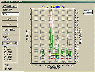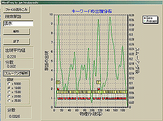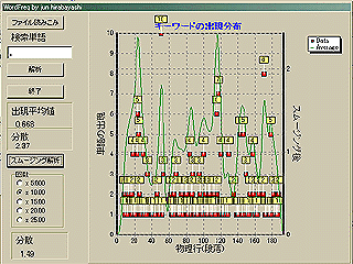 さて次は、「定量化に必要な数値を出す」である。前回の題目で使った「ホトトギス」版「坊っちやん」のダウンロード元のWEBの作成者である木村功氏より、前回の話以後にいくつかアドバイスを頂いた。それが「定量化するにはどのようにしたら良いか」ということであった。それについては、最低限の機能をつけてみた。やったのはただひとつ。出現頻度の分散を計算するようにしただけである。この数値と出現平均値を用いて、色々な文章を解析すれば、このプログラムの返す値の出現分布の分散・平均値・有意水準などを導くことができるだろう。色々な時代の、色々な作家の、色々なジャンルの文章を解析し、それらから得られた値を調べてみればもしかしたら面白いことがわかるかもしれない。