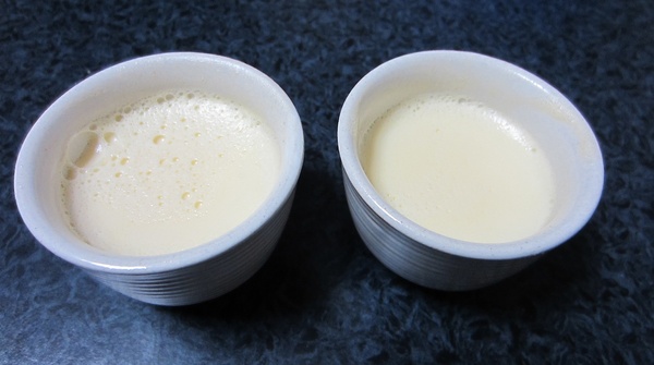 さらに、プリン溶液が沸騰したら、弱火でさらに1分煮込み、そして「色んな大きさのカップ」にプリン溶液を注ぎ込みます。注ぎ込んだ後は、少し冷ました上で、おっぱい溶液に満ちた各種カップを冷蔵庫に入れるのです。