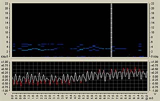 それでは、着信音No4と着メロ「この木何の木」の波形とスペクトログラムを次に示す。それぞれのグラフ中で上は「時間vs周波数分布」を示すスペクトログラムであり、下は「時間vs強度」の波形グラフである。