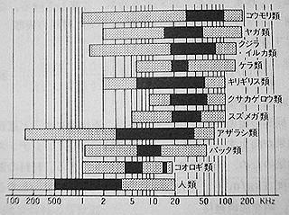 普通は聞こえない周波数の音波を超音波というわけであるから、超音波を聞くというのは何ともスリリングである。参考までに、色々な動物の可聴域を以下に示す。