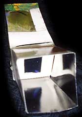 左下がスリット部になっている。中央上の折れ曲がっている部分にグレーティングが配置している。次の写真を見るとグレーティングがあるのが判ると思う。HIRAX一型分光器の内部は散乱光を防止するために、黒く塗ってある。しかし、下の写真を見れば判るように、グレーティングの周りの片側は塗り忘れてしまった。まるで、「耳なし保一」である。