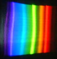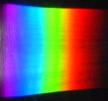 これはデジカメで撮影したものである。スリットが太いので確認しづらいのだが、太陽光のフラウンホーファー線(FraunhoferLine)の一つHβ吸収線が486nm(ここでは水色の中央部)辺りに見えるような気がしないだろうか? いずれ、スリット幅を小さくして、もう少し精度の高い実験をしてみる予定である。