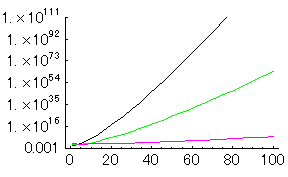 子供の家N=100までの場合の、サンタが計算しなければならない経路の総数(N-1)!/2を以下に示してみる。