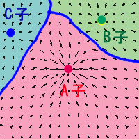 この場合の「恋の山脈」での「恋のベクトル」は先程と同じくこの図になる。つまり、あなたにとって客観的には一番魅力的なのはA子にも関わらず、恋の力に導かれるまま動いていったとしても、必ずしもA子に辿り着くわけではないのである。 さきほどの山と同じく、この場合にも「恋の分水嶺」があって、アプローチをし始める場所によって、B子の方に行ってしまったり、あるいは、C子の方に行ってしまったりするのである。ベクトルの彼方で誰が待っているかは、アプローチ次第だったりするのだ。