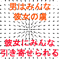 そのため、こんな「恋ポテンシャル」下での「恋のベクトル」を描いてみると、こんな感じになる。「男はみんな彼女の虜、彼女にみんな引き寄せられる」のである。「恋における孤立峰」での「恋のベクトル」の先には必ず「彼女(別につき合うという意味での彼女ではない)」がいるのである。