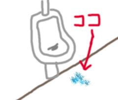 そう、便器にロックオンして放水をしたハズなのに、何故かターゲットである便器まで「小便」が届かずに便器下を汚してしまうのである。実にマズイ事態ではあるがよく見かける風景でもある。便器内を狙ったハズの小便が残念ながら目標地点まで辿り着かなかった場合に起きる悲劇である。