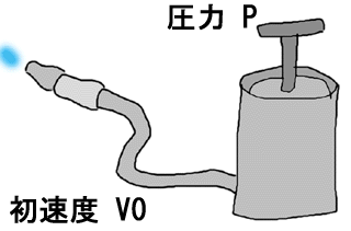 それでは、「銃筒の先端を出るときの初速度」はどのようにして決まっているのだろうか?それを大雑把に考えてみたのが次の図である。腹筋で膀胱に圧力Pをかけて、銃筒の先端から小便を初速度V0で放水作業を行うのである。