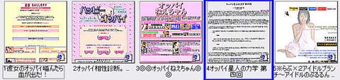 しかし、そんなGoogleの検索結果が私にショックを与えた。ある日、私は”オッパイ”というキーワードで検索をかけた、いや、知人がそのエロ検索をかけたということにしておこう。で、”オッパイ”で検索をかけた結果のサムネール画面が下の一覧である。左から検索結果の1位、2位、…、5位というように並べてある。また、同じサイト内のページは一つにまとめて表示してある。