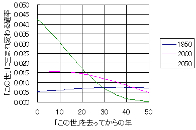 このグラフを眺めれば、例えば1950年に亡くなった人であれば、それから40年弱時が経った1980年後半の年に生まれ変わってくる確率が高いし、一昨年、2000年に亡くなった人がいるならば、今から数年後の年に生まれ変わる可能性が高い、ということが判る。そして、2050年に「この世」から亡くなった人がいるならば、その人は亡くなってすぐの年に生まれ変わってくる確率が高い、と想像できることになる。