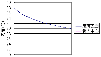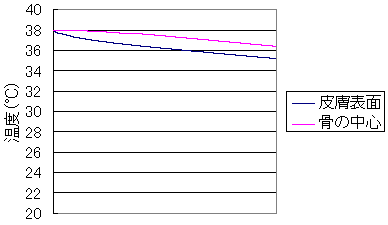 すると、例えば指の皮膚表面と骨の中心の温度の時間的な変化のシミュレーション結果は下のようなグラフになる。皮膚の表面の温度は冷たい風に冷やされて徐々に温度が下がり、計算終了時には指の皮膚表面の温度は35℃程度になっている。そして、それにつれて指の骨の中心の温度も下がっていく。最初は温度が38℃だった骨の芯も、計算終了時には36℃程度にまで下がってしまっている。そう、かつてのワタシのように京都の寒さに「湯冷め」してしまい、確かに体の芯まで冷えてしまっているのである。