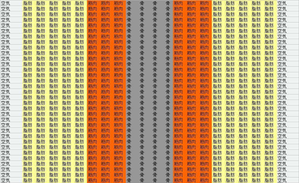 黄色 = 脂肪 橙 = 筋肉 灰色 = 骨 ![]() |