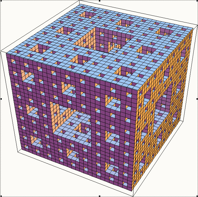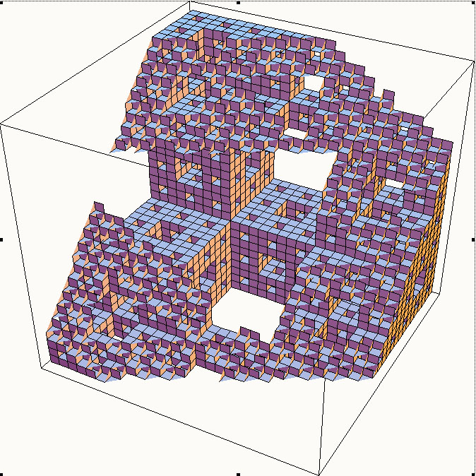 で、ここに貼り付けた画像は中村健蔵氏の「Mathematicaで絵を描こう」 東京電機大学出版局に収録のMathematicaが描くフラクタルキューブ。フラクタルキューブのの外側と内側。フラクタルキューブの中身を見てみたい人はじっくり眺めてみるのだ。