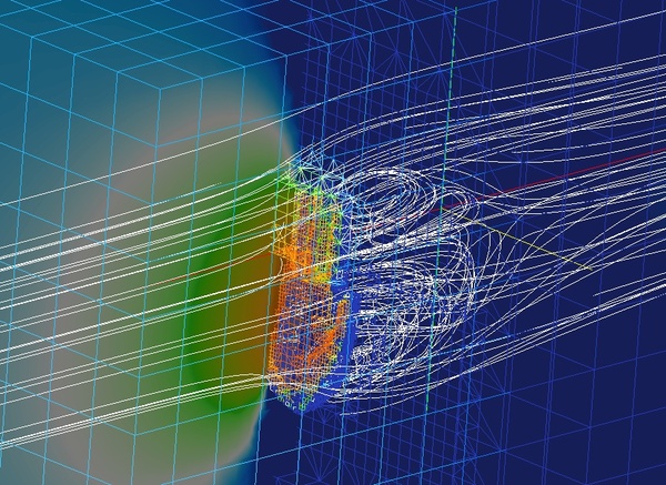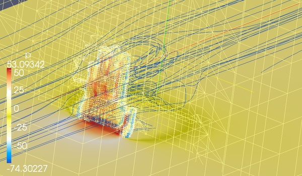 計算のようすが、たとえば上の画像です。掌の周り(特に後方)で空気がうずまき、掌の前の部分では空気圧が高まり、掌の後方では空気圧が低くなっています。