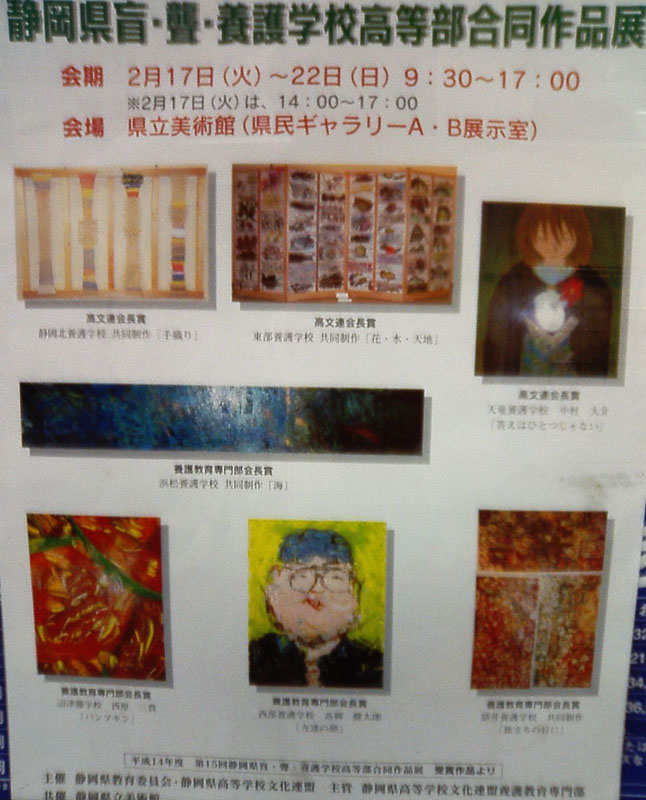 人気のない駅で列車を待っていると、いくつかポスターが貼ってある。静岡県盲・聾・養護学校高等部合同作品展のポスターに目がとまる。どの作品も好きな色合いだし、好きな感じの絵ばかりだ。「海」「パンプキン」「旅立ちの日に」の色合いに目をとられ、他の絵の配置に目をとられ、「答えはひとつじゃない」という題を読んでみる。