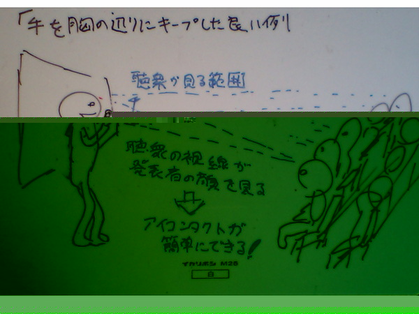 ところで、手書きで「言いたいこと」を描くよりも、コンピュータを使って資料を作る方がずっと時間がかかるように思います。しかも、プレゼンテーション・ソフトウェアで図を作ったりした日には、「考えていること・言いたいこと」がメリハリがつかなくなり、わかりにくい資料になってしまうことが多いようにすら思うのです。不思議なような気もしますが、そう私は感じています。