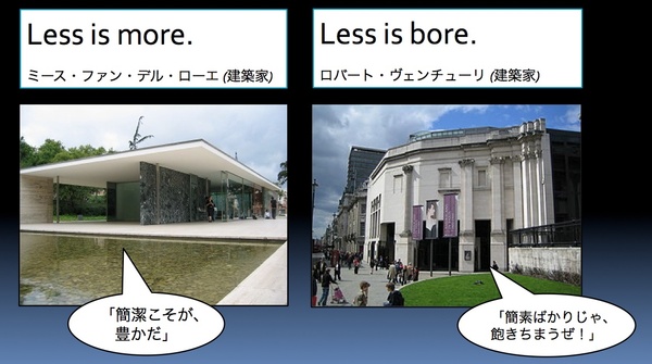 「”Less is more.”(簡潔こそが、豊かだ)」という建築家のミース・ファン・デル・ローエの言葉、そして、その言葉に対して言い換えされた、同じく建築家であるロバート・ヴェンチューリの「"Less is bore."(簡素ばかりじゃ、飽きちまうぜ!)」は、いずれも短く的確で美しい言葉です。