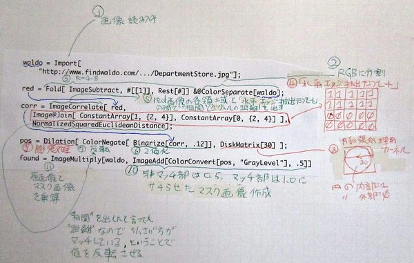 「Mathematicaでウォーリーを探せ!」("How do I find Waldo with Mathematica?")が面白かったので、Mathematicaのコードが何をしているかを眺めてみました。