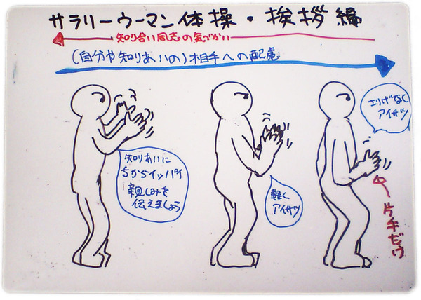 絵心がないせいか、一番右のサラリーウーマンは「まるでホンダ・プレゼンツの"ASIMOロボット"」のようになってしまっていることはさておいて、この「サラリーウーマンたちのコミュニケーション」を眺めていて興味深く感じたことは、すれちがう「知り合いどうしのサラリーウーマン」が何の齟齬もなく「同じレベル」の「挨拶」をしあっていたことだ。