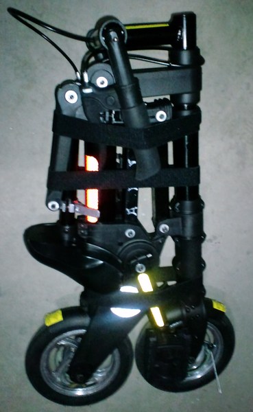 そこで、とりあえず、マジックテープ3本で「ハンドル部分」「ペダル部分」「タイヤ上部」を固定し、「中身丸見え」で輪行するという具合にしてみようか、と思っています。それが、右の写真です。A-bike(型自転車)を折りたたむと、ベビーカーよりも遥かに小さく邪魔にならないサイズになりますから、少し人目を惹かないように、あるいは、他の人に触れた時にも大丈夫なように、クッション性のあるもので覆い、その周りをマジックテープで固定するくらいで良いかな、という具合です。