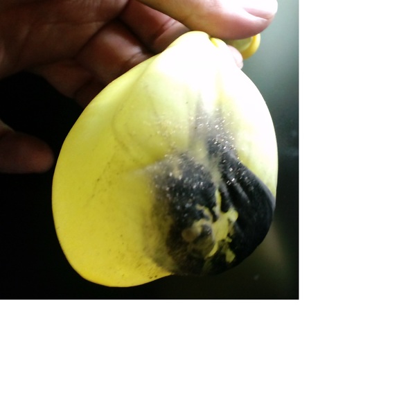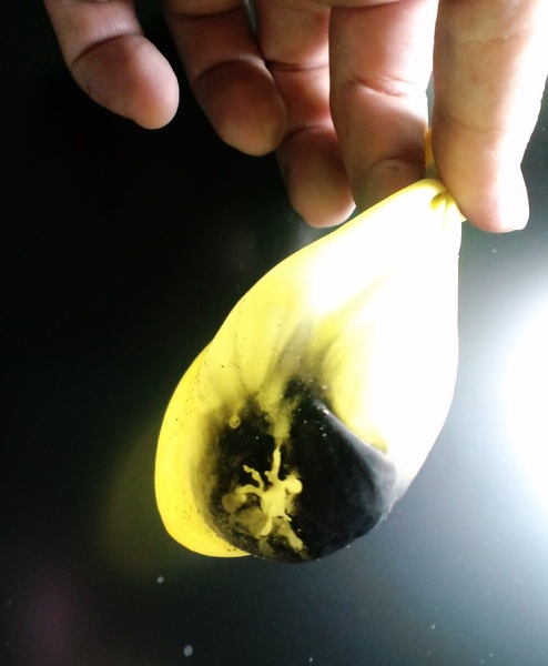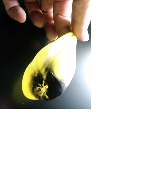 「続々 水風船をライターの炎であぶると何が起こるか考える!?」の続きです。実験に使った水を入れた風船を観察してみることにしました。風船の中に水が満ちていた時にはわかりませんでしたが、水がある程度抜けたときのようすを撮影してみたのが下の写真です。写真を眺めてみると、火に炙(あぶ)られていた部分が何だか伸びていることがわかります。横から見ると、その部分がプックリ膨らんだ姿になってしまっています。