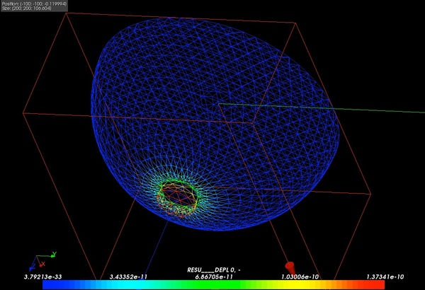 プリプロセッサソフトウェアのSalome・構造解析ソルバのCode_Aster・ポストプロセッサのParaViewが統合されたSalome-Mecaを使って「指で押されたおっぱい変形」を計算してみました。ヤング率は2×10^4、ポワソン比は0.5として、軽く胸の先を押した時の変形や応力分布などを計算してみる、という具合です。
