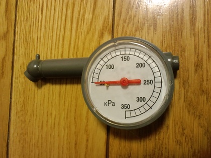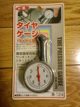 続 「小さな風船」と「大きな風船」の圧力はどちらが高い!?を書く少し前に、100円ショップに行ってこんなものを買ってきました。気圧を簡単に測定することができる「ダイヤル式タイヤゲーシ」です。測定限度圧350kPaという高圧まで測ることができるにも関わらず、税込105円(消費税5%の現在)という実にリーズナブルな商品です。