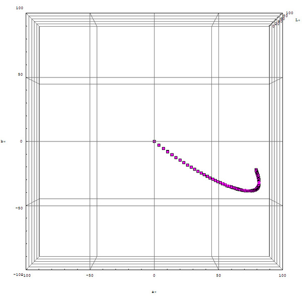 最初のラフスケッチが、絵画の原理を自分なりにおさらいするためのものだったので、濃度変調・面積変調などを扱おうとする場合には、比較的簡単に・気持ち良く作業ができると思います。たとえば、下記のようなコードを書けば、D65光源のもとで、赤紫色の絵具を重ね塗りしていったときの色の具合を CIE Lab 空間で眺めたりすることができます。