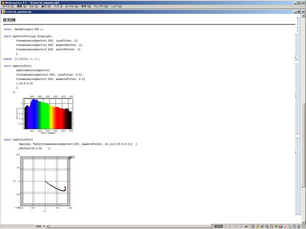 以前のものからの変更点としては、"spectorPlot"や"labPlot""labColorPlot"など、関数名のMathematicaの命名規則に合わせた変更、加法混色・減法混色用関数の追加・グラフ表示関数の追加・バグ修正といったところです。