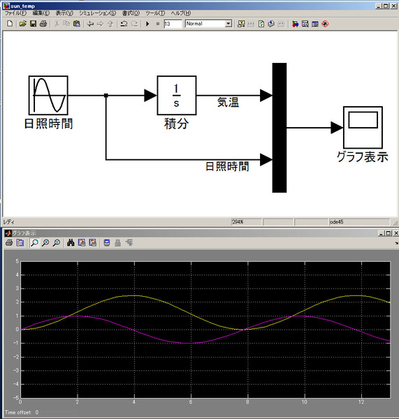 d TEMP /dt = SUN平均気温は平均日照時間を積分したもの、ということになります。そんな関係をSimulinkでモデル化し(数値はまだ合わせていません)、グラフ表示してみたのが下の図です。気温が日照時間に対する「位相遅れ」を持っていることがわかります。