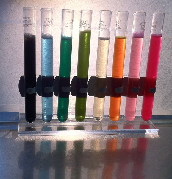 まずは、製菓に行き(手に入る限りの)すべての食用着色料を買ってきます。そして次は、酒屋に行き発泡酒(着色料が思ったより高く、研究予算が尽きたのです)を買いました。そして、試験管に「黄色いビール(本当は発泡酒…以下省略)+着色料」を注ぎ込み、ビールの泡が消えてしまうことも恐れずに・ひたすらビールと着色料をかき混ぜます。そういう風に、世界各国にあるだろう「色んな色のビール」を作ってみたのが下の写真、まさに虹色/7色のビールです。