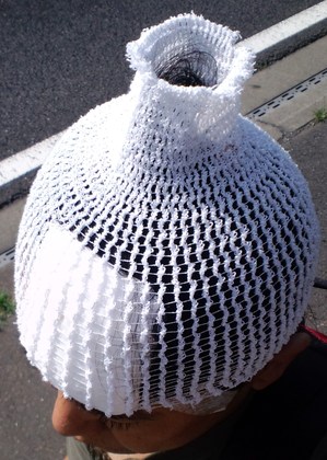 というわけで、手足が生えた歩く”白い”マスクメロンとなっている。道路に横たわる影だけを見るならば、まるでモヒカン男かチョンマゲ侍が歩いているようだ。実に情けない格好だ。