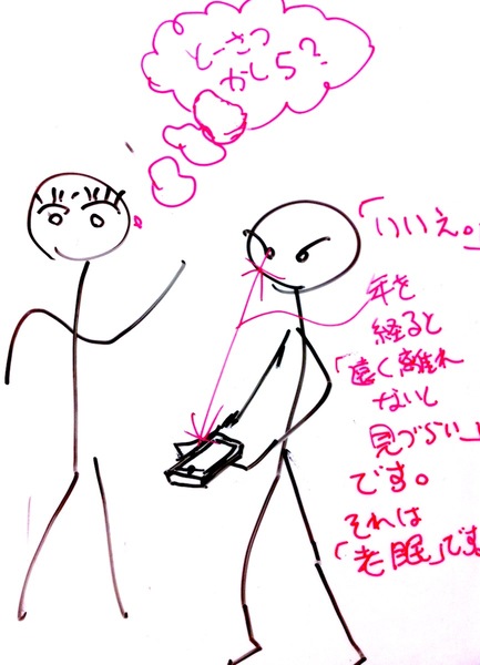 年をとると、目のピント調整機能が衰えて、特に近くのものを見ることがしんどくなります。そのような現象を「老いた眼」と人は書き、そして、それを「老眼(ろうがん)」と呼びます。