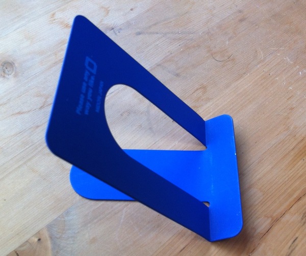 右上写真には、大小2つのサイズのブックスタンドが並んでいます。 小さい方のスタンドは、高さ10cmほどで、スマートフォンやケータイを乗せるのにピッタリのサイズです。 となれば、グイッと曲げて「傾斜台」に仕立ててみよう!というわけで、スプーン曲げより簡単に、指の先で軽〜く押して・曲げてみたところが、右横の写真です。 一瞬でできあがったわりには、とても良い感じの「iPhone(スマートフォン・ケータイ)台」ができあがりました。