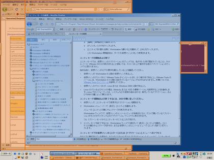 Windows上で動かしている VMware にアップデートをかけると、「ユニティ(Unity)機能」を使うことができるようになっていた。Unity機能とは、仮想PC上で動かしているシステムのウィンドーをホスト側の画面にシームレスに表示する機能である。これまでも、OS X上で動くVMware Fusionや、(やはりOS X上で動く仮想PCソフトウェアである)Parallelsではこういった機能がサポートされていたが、Windowsでも「ホストPCと仮想PCのウィンドーをシームレスに使うことができる環境」ができた。