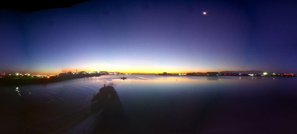 28日の早朝4時に、羽田空港に自転車に乗って行ってみました。寒さにブルブル震えながら、弁天橋から見た日の出間近な東の海は、意外に奇麗な景色かも。滑らかな水面に、波を描いていく船は、沼津の港で眺めてた景色に似ています。