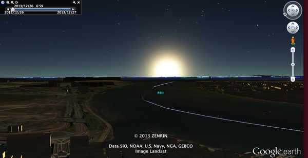 今の時期、弁天橋から多摩川河口を眺めると、太陽が河口先の海から上る…ということがGoogle Earthで確認できます。少し寒いけれど、元旦の初日の出を、羽田空港の国際ターミナル近くで眺めるのも良いかもしれません。…あるいは、暖かい国際ターミナルの中から、初日の出を眺めてみるのも良いかもしれません。 海の外に繋がる国際ターミナル(あたり)から、次の年を照らす初日の出を眺めてみると、何か新しいことができるかもしれません。
