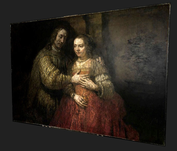 こうしたRaking light photography(測光線写真) を眺めると「私たちは3次元情報を感じる」…ということは、コンピュータにだって測光線写真から絵画の3次元情報を復元できるはず…ということで、2014年の終わり近くの今日…WebGLベースのレンブラントの「ユダヤの花嫁(イサクとリベカ)3次元風…を作ってみました。