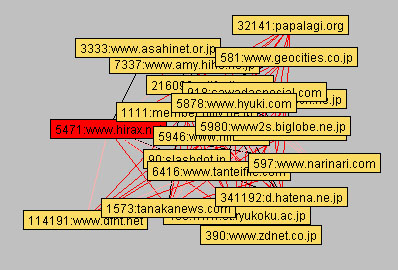 ついにはてなダイアリでおとなりページの地図がGraphとして目に見える形になった。いやぁ、こうして眺めてみるとやはり面白い。例えば、hirax.netの場合なんて眺めてみても感心するくらい面白い。きっと、これで遊ぶ人が増えてはてなの負荷はさらに増大しそうだけれど、見ていてとても楽しいのである。