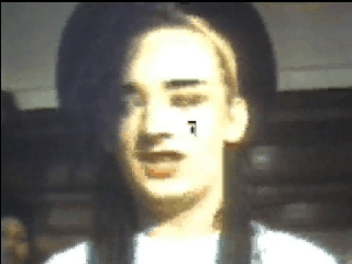 Untitled 自分の視線をチェックした時に眺めていたのは、Culture Clubのビデオ画面。"Do You Really Want To Hurt Me?"を眺めているときの、自分の右目の注視点(眺めている場所)を調べてみたのだった(私の場合、左目もほぼ同じ場所だと思う)。例えば、こういった「注視点の変化を示した動画1注視点の変化を示した動画2」である(画面中に小さな矩形で注視点の場所を示している)。