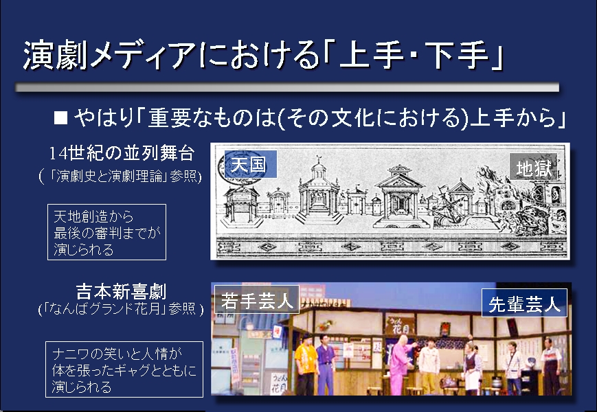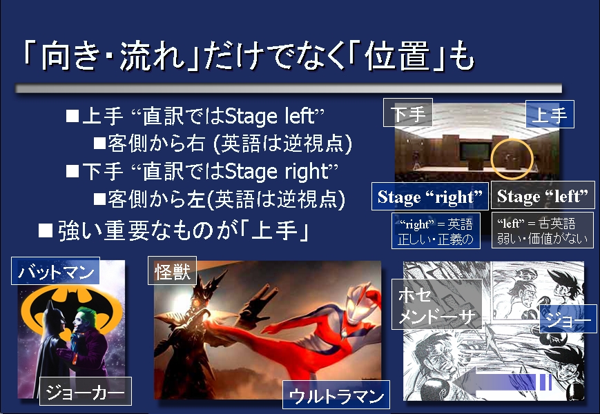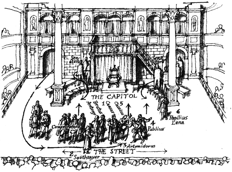 ジュリアス・シーザーグローブ座の配置と典型的な進行 ヨーロッパ文化でもミュージカル・演劇などにおける「(その文化中における)上手」は観客から向かって左側だといいます。例えば、右の配置図は、グローブ座のステージ配置とその舞台上の役者の動き、及び、シェークスピアの「ジュリアス・シーザー」の進行具合を示した図です。観客から言うと、左から入場し、右へと退場しています。ただし、シェークスピアの時代には舞台上に「(上に位置する)二階」が使われるようになっており(ロミオとジュリエットのバルコニーのシーンなんか誰でも脳裏に浮かぶのではないのでしょうか)、つまり、舞台上に(容易に上下が推定しやすい)次元が新たに一つ付け加えられており、その影響が「上座と下座」に及んでいるだろうことも想像できます。