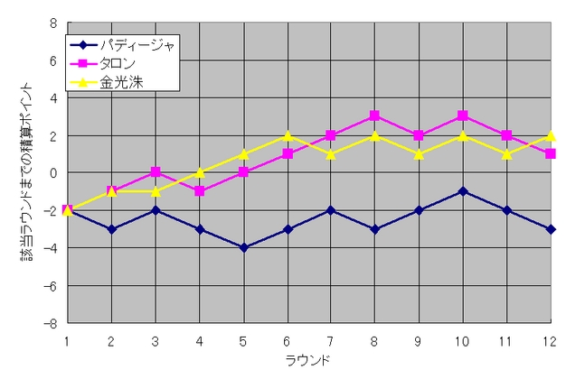 そこで、次のグラフは「各ラウンドまでの、それぞれの審判のポイントを積算したもの」です。つまり、右上のグラフを順次積算していったものです。このグラフも、0を境に上が亀田優勢で、0より下がランダエタ優勢となります。(ボクシングのルールはよくわからないのですが)最終的には、12ラウンド時点で、0より上にいる各審判がの数と、0より下にいる審判の数で勝敗が決まるわけですね。で、このグラフを見ると、何やら審判の「動き」に傾向があるように見えてきます。例えば、金光洙・タロン組とパディージャ組に分かれてる?とか…いえ、もちろん、単なる先入観なんでしょうけれど…。それにしても、最終ラウンドで「金光洙の黄色ライン」は下に下がってしまったら、0になって引き分けになっていたんですね。