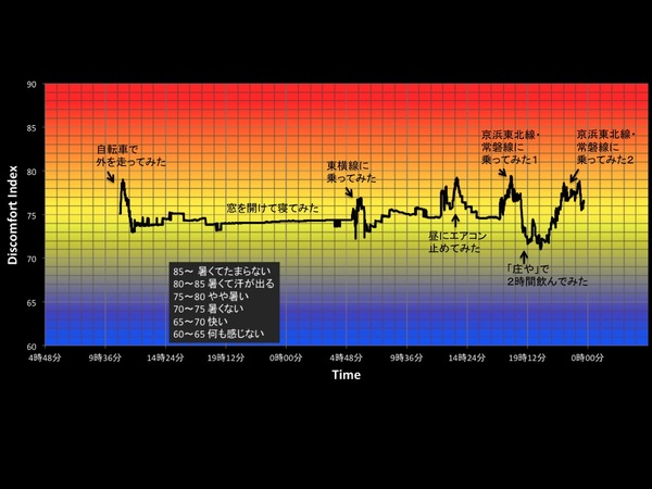 まずは、温度・湿度から、体感の「暑さ・寒さ」に近い「不快指数」を算出し、その時何をしていたかを簡単に記入してみたのが下のグラフです。