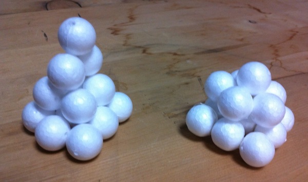 ところで、「十五個のお月見団子」を一体どんな風に積み上げるものでしょうか? 十五個の「球」をピラミッド型に積み上げるというのは、少し考えてみれば、「とても難しい」ということに気づかされます。