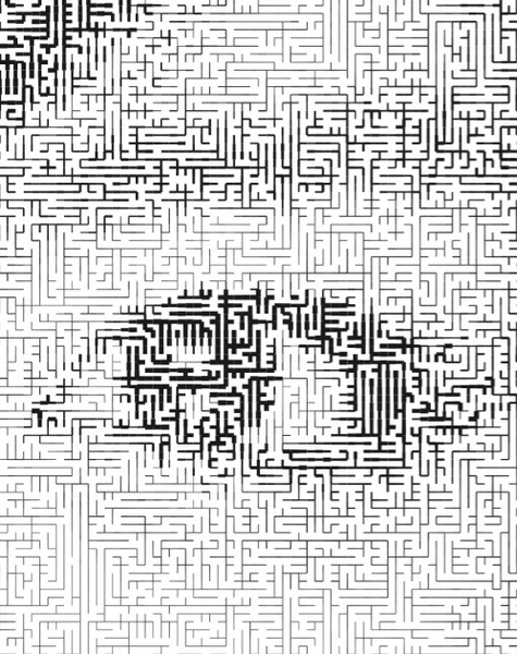 AKB48 24thシングル選抜じゃんけん大会で篠田麻里子が優勝したので、記念に「巨大なAKB48 篠田麻里子 迷路」を作ってみました。遙か遠くから眺めるとニッコリ微笑む巨大な篠田麻里子に見えるけれど(篠田麻里子が巨大だと言っているわけではありません)、近づいて眺めてみるとなんとビックリ、それは実は限りなく巨大な迷路だった!!という「巨大なAKB48 篠田麻里子 迷路」です(「巨大なAKB48 篠田麻里子 迷路」PDF 5.1MB)。その巨大迷路が「迷路」であることがわかるように、右目辺りを拡大してみたのが右の図です。このあまりにも巨大迷路、拡大して眺めてみないとわかりませんが、右上の角に「迷路の入り口」があり、左下角に「出口」があります。
