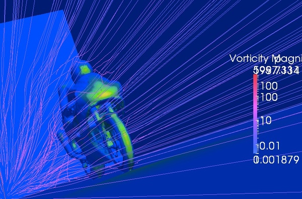 数値計算フレームワークのOpenFOAMのチュートリアル、走るオートバイの空気抵抗を求めるサンプルを動かし、バイクの各部分が受けてる空気抵抗(圧力)を眺めてみると、空気にぶつかっていく先端部分に(空気抵抗は)ほぼ集中しているよなぁ…と感じさせられます。たとえば、上の画像はバイクや乗員が受ける圧力を色で示し、さらに空気が流れる流線を重ねたものですが、空気を切り裂く先端部分に圧力がほぼ集中していることがわかります。