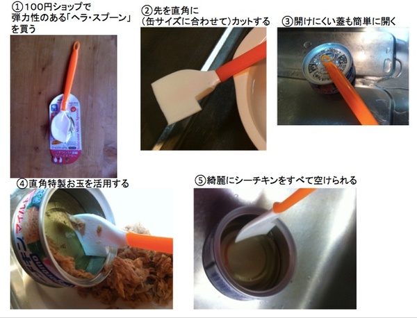 - 缶の隅にツナが引っかかり・取れない(スプーンやフォークでは形状が合わない) )